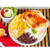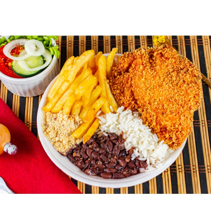 Arroz branco, feijão preto bem temperado, salada do dia, batata frita ou purê de batata e farofa