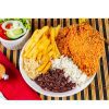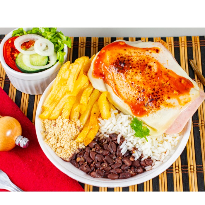 Arroz branco, feijão preto temperadinho, salada do dia, batata frita, purê e farofa